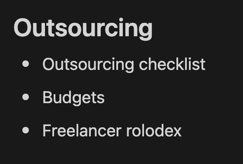 This is literally the same thing as your self-service checklist but for outsourcing. Two columns, Yes/No, maybe a recommended vendor if you'd like, but again the purpose here is intention. If you're only outsourcing because you run out of bandwidth then you're adding distractions. This list should be a predetermined decision of what you've decided always gets outsourced, not just sometimes.