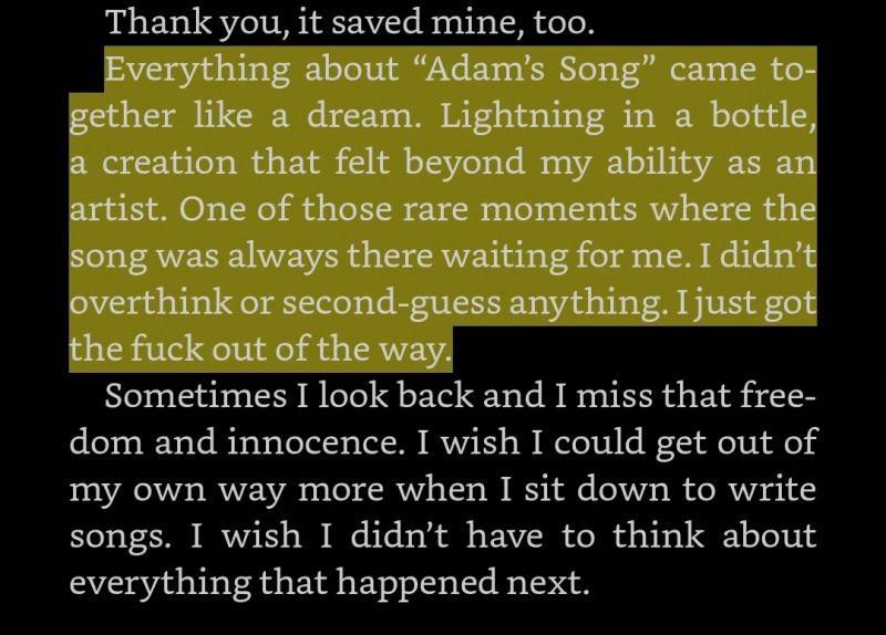 I just finished reading Mark Hoppus' autobiography, Fahrenheit-182. Mark is the bass player from blink-182. If you know anything about blink, the music is silly and goofy and aimed at teenage boys. Then we got Adam's Song which was serious, dark, and unlike anything else the guys wrote. In the book, Mark wrote: