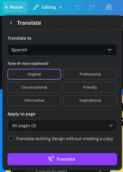 Fill empty cells is cool but what if you need to translate a whole design (single page or multi), under the Resize menu in the toolbar there’s a translate button which will let you translate your entire design, deck, or doc. It’ll create a copy or just replace the working file you’re in. It works the same way as resizing does.