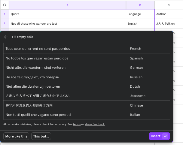 For the certificate, you have to record a lesson using a real life example, mine was “I work for an international organization and need to create assets in multiple languages” and that’s where Fill Empty Cells comes in. You write your copy in English, create a language column and fill that with the languages you need, highlight the cells, click Fill Empty Cells in the Actions menu and there it is. This is using their AI and can also generate copy in addition to translate.