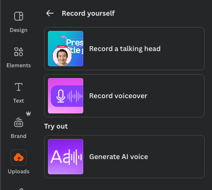 You can record up to 25-minute Loom-style talking head videos and VOs directly in Canva. It’s a great way to add a talk track to a presentation or asset. Once you’ve recorded you can edit and move the video to the desired place. It’s a really nice way to remove an additional tool from your workflow (it does only work in Canva though).